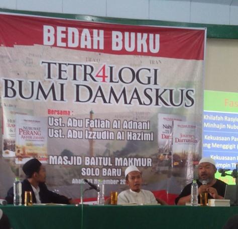SOLO (Voa Islam) – Tema Akhir Zaman nampaknya sekarang sedang menjadi trend kajian keislaman di kota Solo. Sudah beberapa kali di berbagai masjid diadakan Bedah Buku yang bertemakan Akhir Zaman, pagi tadi (23/11/2014) di masjid Baitul Makmur, Solo Baru, Sukoharjo juga diadakan hal yang sama. Bedah Buku Tetralogi Negri-negri Akhir Zaman yang ditulis oleh Ustadz Abu Fatiah Al Adnani dibedah langsung oleh sang penulis dengan didampingi Ustadz Fuad Al Hazimi.