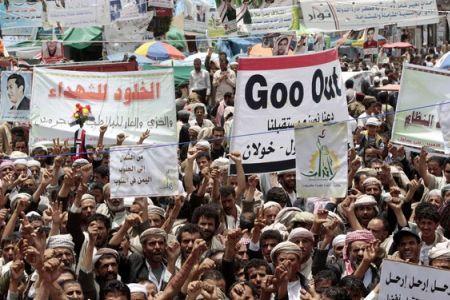 Di Jalan Sittine, sebelah barat Sanaa, pemrotes anti-Saleh berkumpul dengan membawa spanduk-spanduk yang bertuliskan "Orang-orang AS dan Saudi, jangan campuri urusan Yaman" dan "Ali Saleh secara politis tewas".