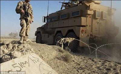Misi Dukungan Tegas yang dipimpin NATO di Afghanistan mengatakan "Sebuah kendaraan anti ranjau AS menghantam sebuah bom rakitan dekat Jalalabad pada 13 Maret. 3 tentara AS menderita luka ringan dan menerima pengobatan."