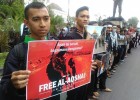 Ratusan massa yang menamakan diri Aliansi Mahasiswa dan Pemuda Peduli Palestina mengelar aksi solidaritas untuk Masjid Al-Aqsha, di bundaran Gladag Solo, Jawa Tengah Jumat (21/7). Pakaian serba hitam yang dikenakan sebagai simbol duka untuk Palestina.