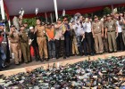 Pemerintah Provinsi DKI Jakarta memusnahkan sebanyak 14.997 botol miras di kawasan Monas, Jakarta Pusat, Ahad (10/6/2018). Miras sebanyak itu merupakan hasil penertiban dari lima wilayah kota sejak Januari-Mei 2018.