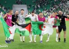 Para pemain Aljazair merayakan kemenangan mereka, tidak hanya dengan bendera nasional mereka tetapi juga menunjukkan solidaritas lama mereka dengan perjuangan Palestina dengan mengibarkan bendera Palestina dan kufiyas setelah peluit akhir pertandingan ditiup wasit dengan kemenangan 5-3 atas Maroko.