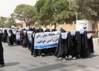 Para mahasiswi di Universitas Kabul Afghanistan duduk dalam barisan di ruang kuliah universitas Kabul pada hari Sabtu (11/9/2021), bersumpah untuk mendukung kebijakan Taliban tentang hijab dan pemisahan gender saat pembelajaran di kelas.
